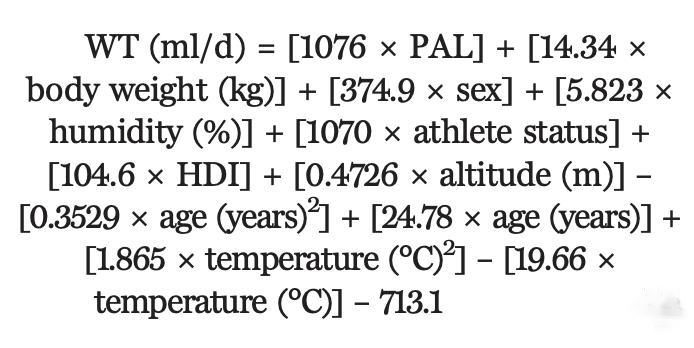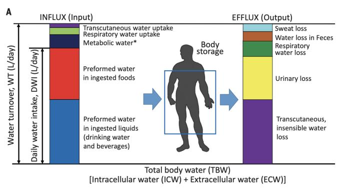 在所有条件相同的情况下,男性和女性的差异大约是半升水的周转量。研究结果预计,一个20岁、体重70公斤、生活在发达国家的海平面高度、平均气温10摄氏度、相对湿度50%的非运动员男性,每天会吸收和流失约3.2升水。同样年龄和活动水平的女性,体重60公斤,住在同样的地方,需要消耗2.7升水。