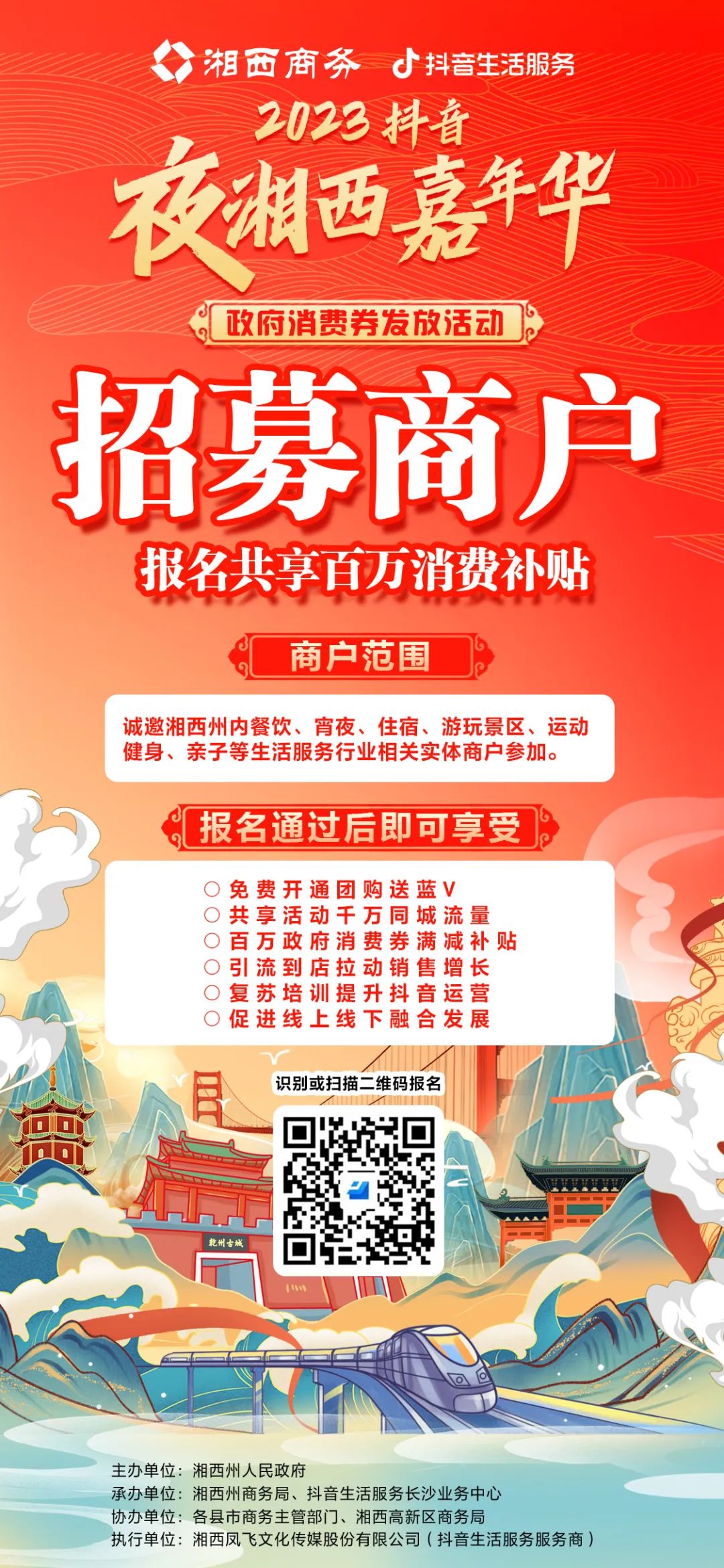 湘西州内餐饮、宵夜、住宿、游玩景区、运动健身、亲子等生活服务行业相关商户,需报名并与抖音生活服务服务商湘西凤飞文化传媒股份有限公司签订服务协议,具体以抖音生活服务审核为准。