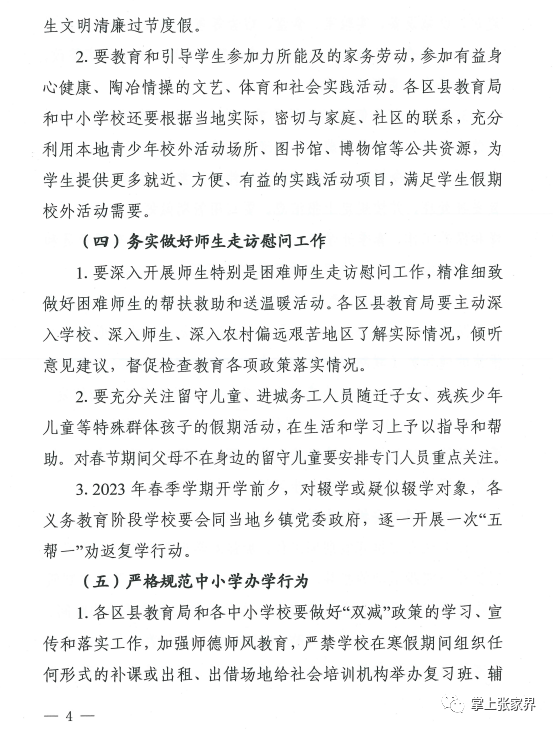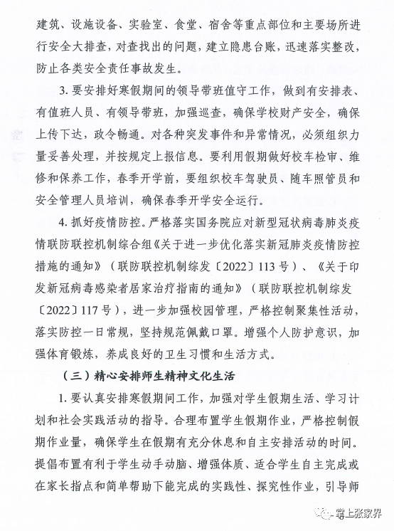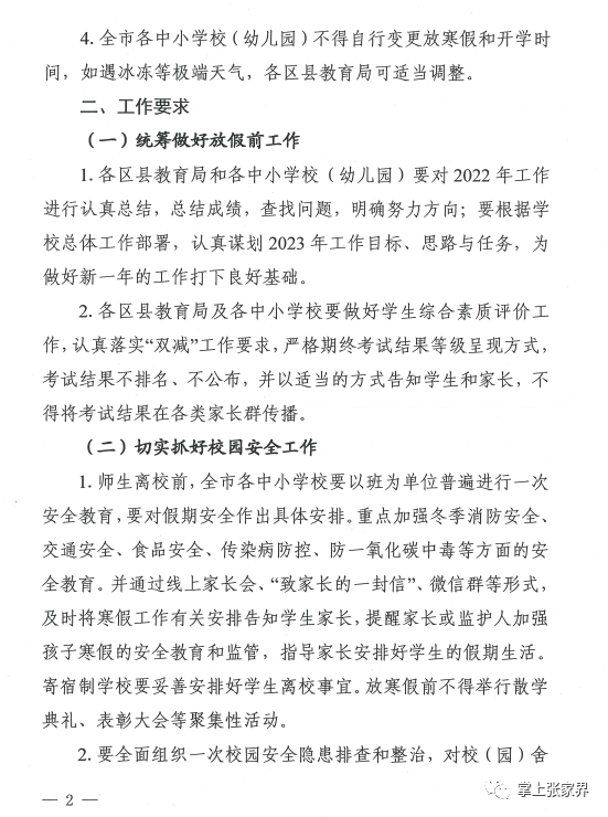 4.全市各中小学校(幼儿园)不得自行变更放寒假和开学时间,如遇冰冻等极端天气,各区县教育局可适当调整。