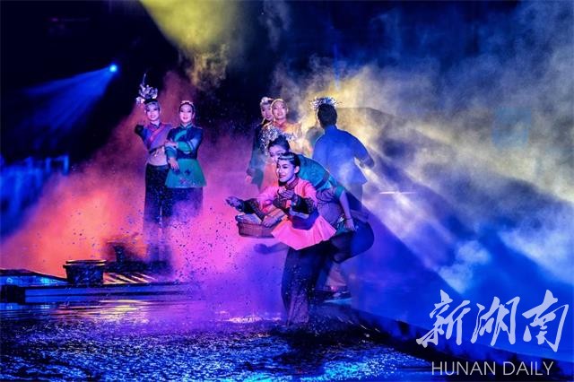 陈思思将演唱的《棒槌捶衣》是首民间小调,在演出情景设计中,演员小伙们在船上忙碌地整理着货物,姑娘们来到岸边捶洗着衣服,配合轻快婉转的曲调,小伙、姑娘们互相调侃嬉闹,将枯燥的排帮生活表现得轻松自在。半个铜钱剧场搭建的舞台效果,与《棒槌捶衣》的表演场景融入得恰到好处,引人入胜。