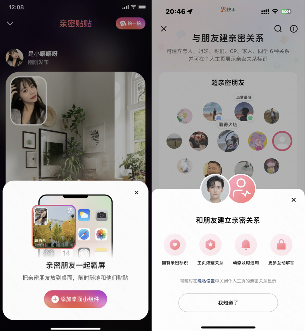 快手通过强化产品的交互功能,不断增强用户的社交粘性, 伴随着平台社交互动与信任氛围继续加强,快手互相关注的用户对数达235亿对。”亲密贴贴”是近期上线的一款社交新功能,被快手用户喜欢。