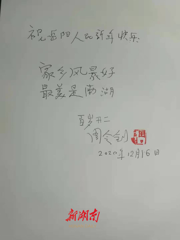 2019年,大爱·大美一一徐悲鸿与周令钊、戴泽艺术展在湖南博物院举行。周老回长沙看展览,我们开心畅谈了2个多小时。临近12点时,我请周老为这次家乡展览活动题词。离开家乡90年的周令钊先生,用一口原汁原味的地地道道的平江家乡地方口语说:“好啊好啊!我祝福家乡人民新年快乐!” 随即提笔挥写:“家乡风景好,最美是南湖。”刚劲有力,力透纸背。当时正值新春佳节来临之际,百岁周老的题字是送给家乡人民的美好祝福!