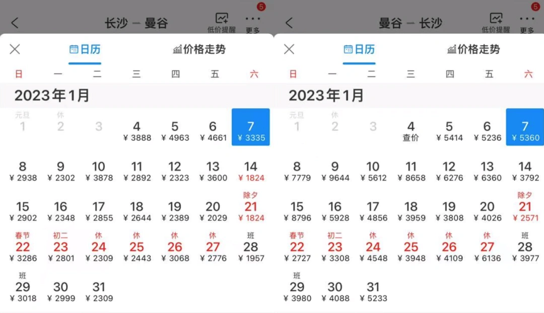 另一热门旅行目的地泰国曼谷,长沙至曼谷的去程航班大多为2000元至3000元,但返程航班大多在5000元至8000元左右,两地往返下来,交通费用就接近上万元。