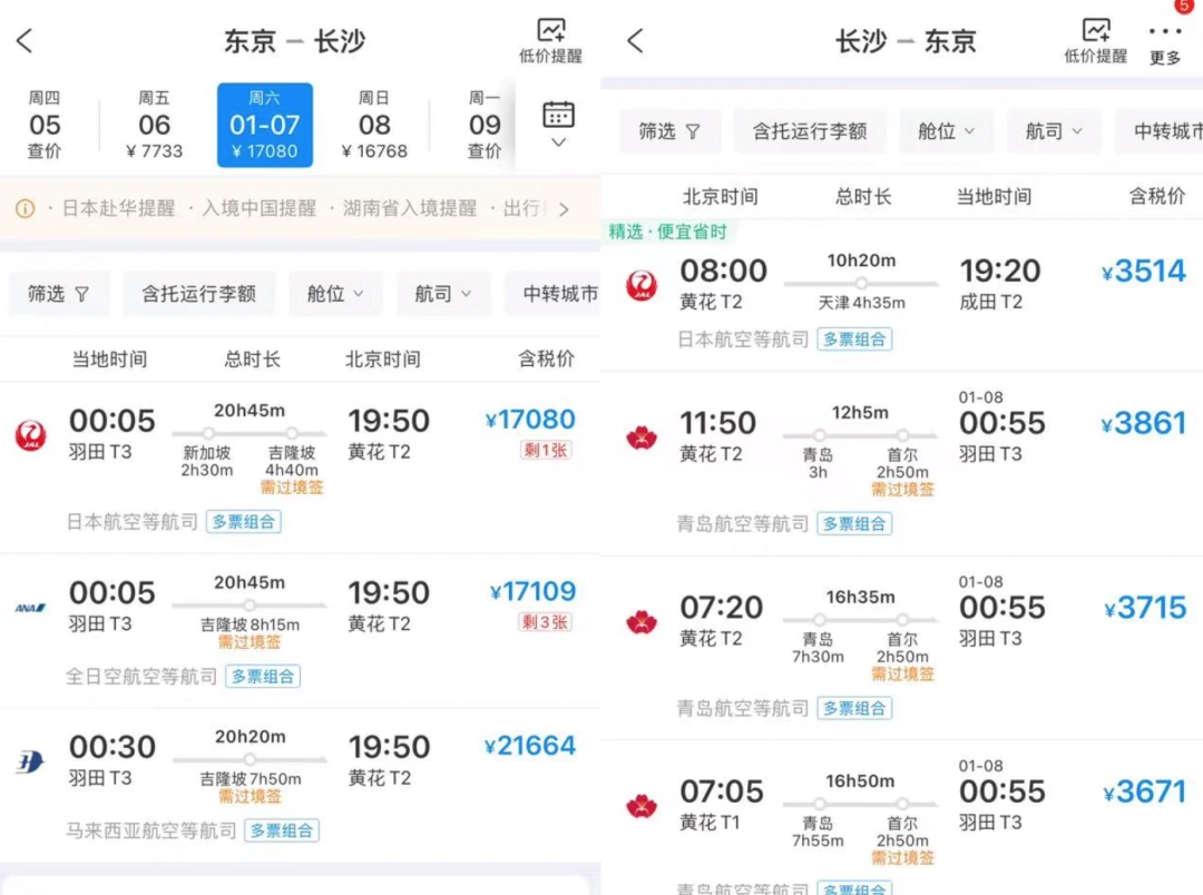 以出发地长沙为例,2023年1月长沙飞往东京的机票大多在1500元至3000元不等,但其返程机票却大多高于5000元,甚至有部分航班机票高达2万元,回国机票价格比出境机票价格贵2-3倍不等。