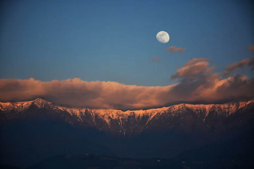 隆冬时节,云南大理苍山顶上白雪皑皑。近日,有摄影师在苍山西坡的大理州漾濞县境内,拍到苍山顶上的“日月同辉”景象。只见夕照之下,苍山顶上金光闪闪,一轮明月高悬苍山之巅,景色十分壮观。