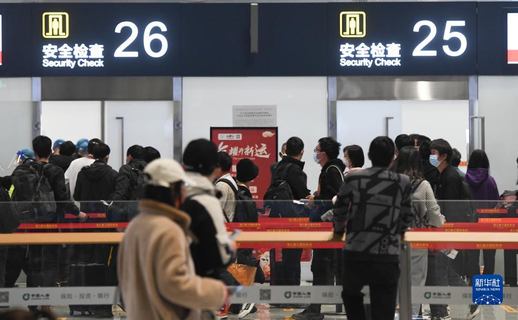 1月7日,在海口美兰国际机场,旅客排队等待安全检查。新华社记者 杨冠宇 摄