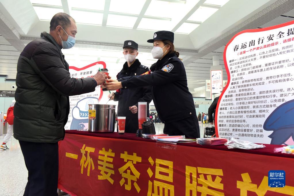 1月7日,在安徽合肥南站内,合肥铁路公安处民警张婷(右)、王子棋(中)给一名旅客送上免费姜茶。新华社记者 郭晨 摄
