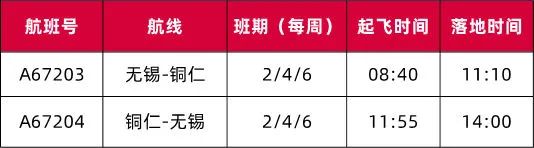 1月19日起,湖南航空A67203/4无锡—铜仁航班将使用空客A320飞机执飞,班期为每周二、周四、周六。其中去程A67203无锡—铜仁航班计划08:40从无锡苏南硕放国际机场起飞,11:10抵达铜仁凤凰机场;返程A67204铜仁—无锡航班计划11:55从铜仁凤凰机场起飞,于14:00抵达无锡苏南硕放国际机场。