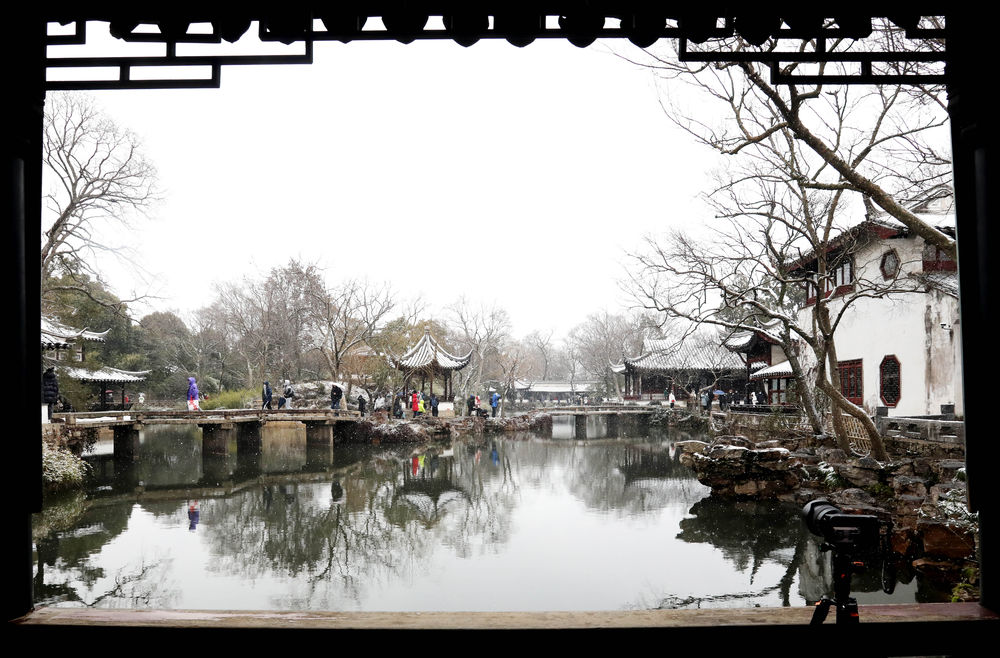 1月15日,游客在江苏苏州拙政园观赏雪景。新华社发(杭兴微 摄)