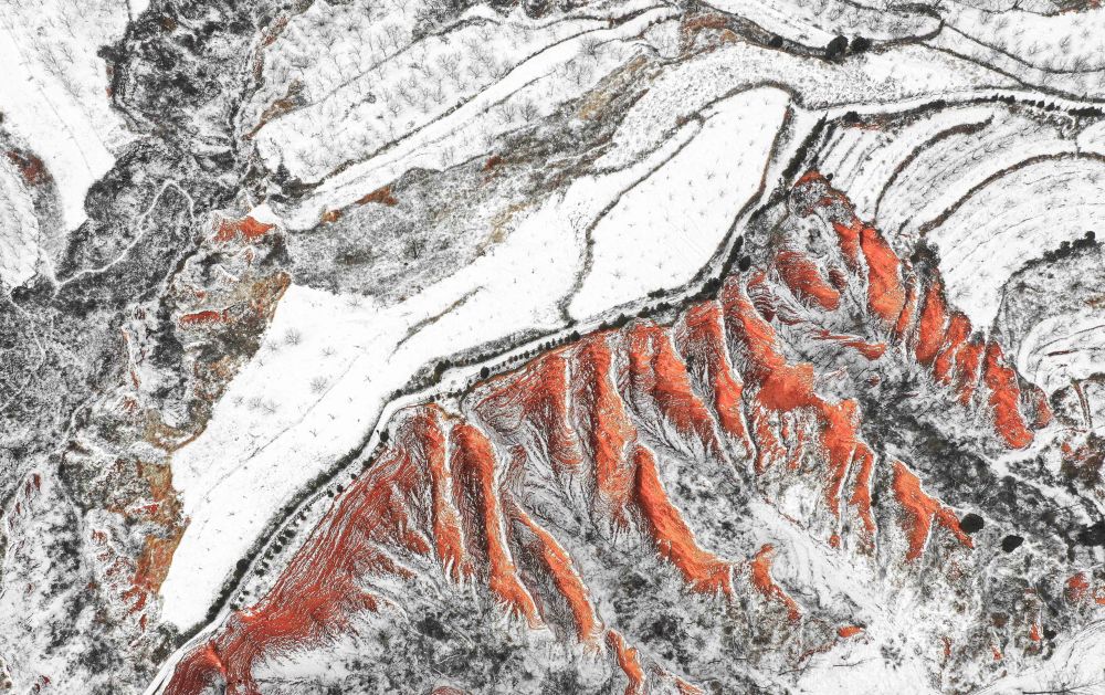 1月15日拍摄的山西省临汾市襄汾县陶寺乡梯田雪景(无人机照片)。新华社发(李现俊 摄)