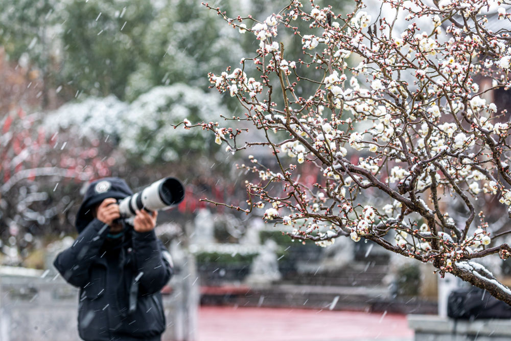 1月15日,在重庆市南川区大观镇铁桥村,摄影爱好者在雪中拍摄梅花。新华社发(瞿明斌 摄)