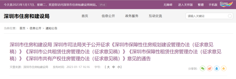 1月17日,深圳市住建局发布了保障性住房相关的4份征求意见稿,包括《深圳市保障性住房规划建设管理办法(征求意见稿)》《深圳市公共租赁住房管理办法(征求意见稿)》《深圳市保障性租赁住房管理办法(征求意见稿)》《深圳市共有产权住房管理办法(征求意见稿)》。