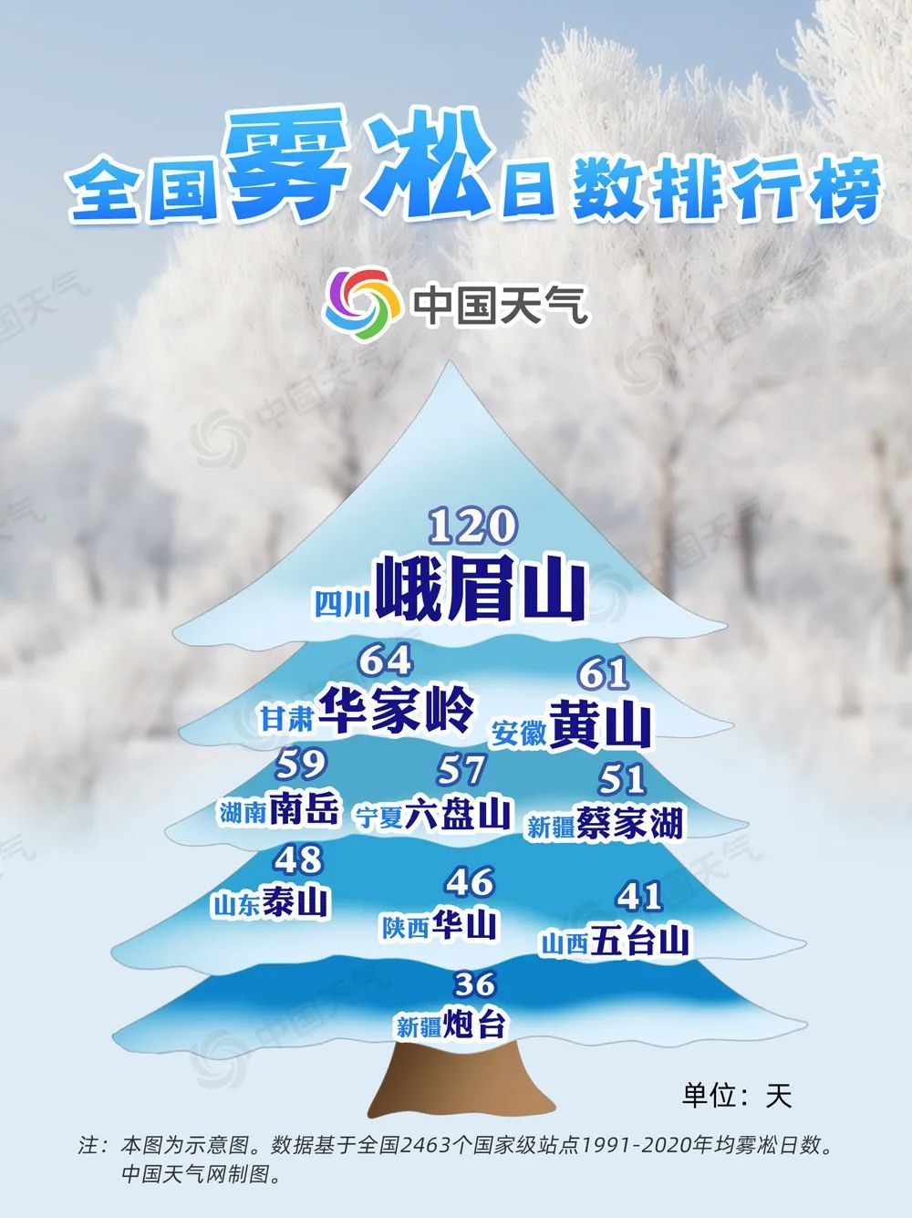 其中北方雾凇分布广、出现天数多,新疆北部、内蒙古东北部、黑龙江中西部、 吉林中北部等地部分地区年均雾凇日数在5天或以上,新疆北部大部年均雾凇日数超过10天,局地甚至超过30天。南方年均雾凇日数大于10天的区域则零星分布于各大名山,如峨眉山、黄山等地。