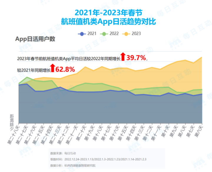 在春运和元旦假期的双重影响下,2023年春节航班值机类App的日活也呈现持续上涨的趋势。对比历年同期数据,2023年春节前航班值机类App平均日活较2022年同期增长39.7%,较2021年同期增长62.8%。