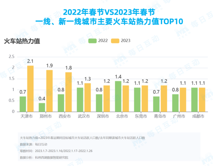 一线、新一线城市主要火车站的热力值,热力值数值大于1代表火车站热度高于上一年同期水平。上榜数据显示,天津市、郑州市、西安市、武汉市、深圳市、北京市、东莞市、青岛市、广州市、成都市是火车站热力值排前十的城市。此外,从整体数据看,2023年春节19个城市中有17个城市的火车站都变得比2022年更为忙碌。