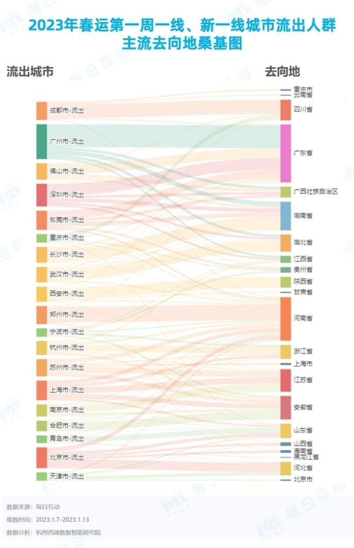 春运第一周,19个一线、新一线城市中去往广东省、河南省、湖南省、安徽省的人数最多,粤豫湘皖是2023年春节“归家人”最多的省份。从桑基图流向分布看,除了北京市、上海市、宁波市流出人群主流去向地分布较为均匀以外,其他城市的流出人群主要还是去往同省份的其他地区。可见受疫情影响,这几年有更多的务工者选择就近的省内就业机会。