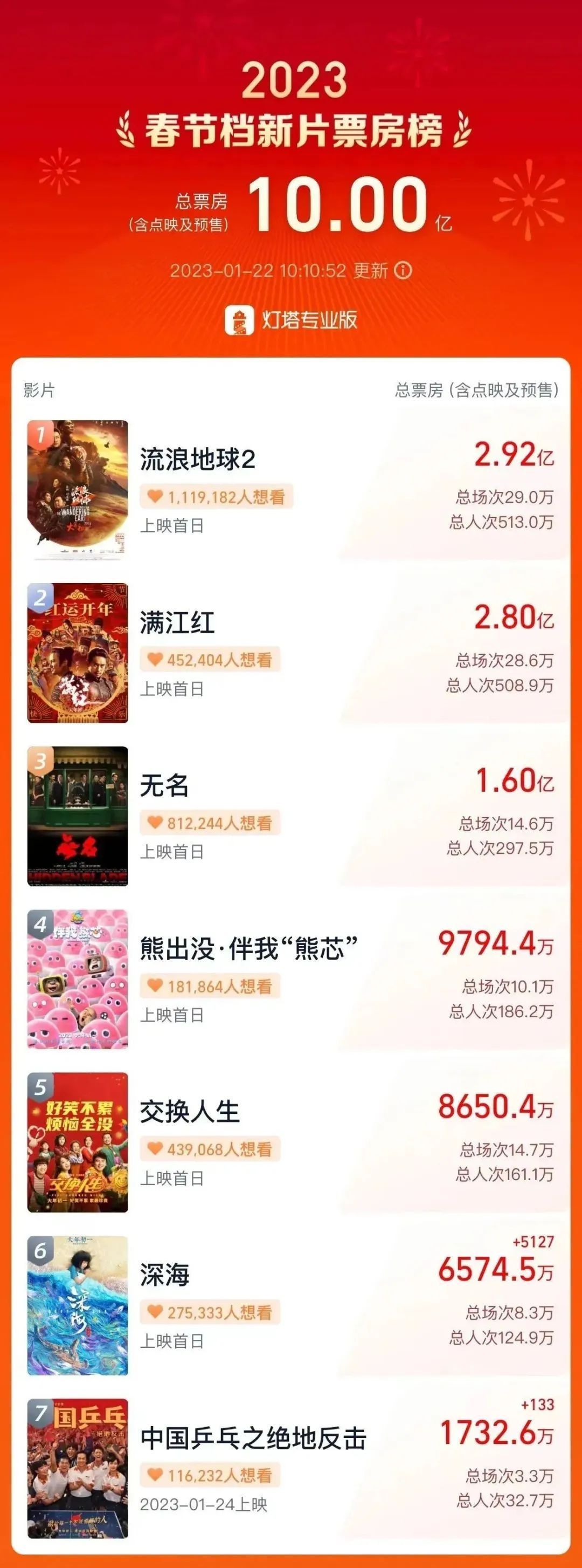 据灯塔专业版实时数据,截至1月22日10时10分,2023年春节档实时预售总票房达10亿。《流浪地球2》《满江红》《无名》分列前三名,《熊出没》超过《交换人生》位列第四。
