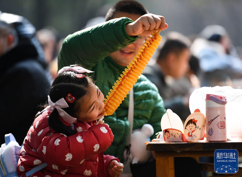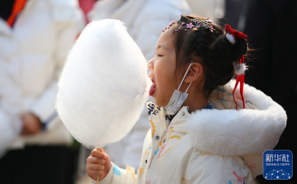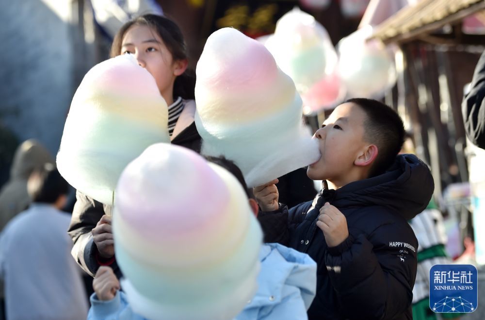1月24日,在河北省石家庄市鹿泉区土门关驿道小镇,小朋友品尝棉花糖。新华社发(张晓峰摄)