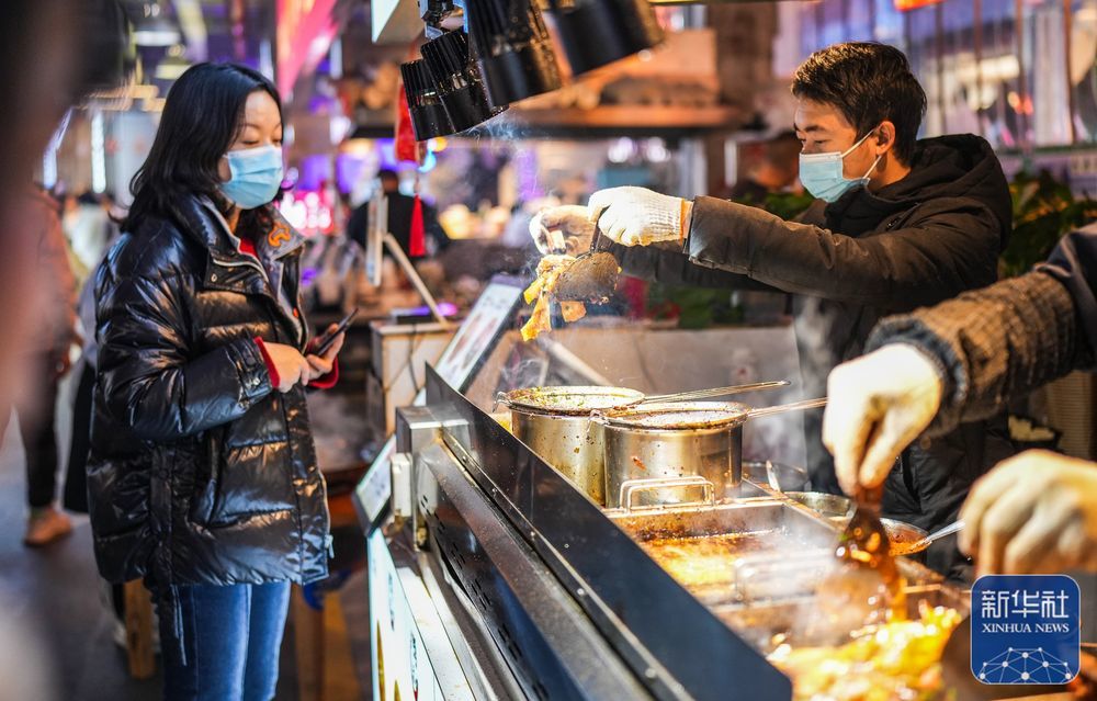 1月23日,顾客在贵州省贵阳市南明区“青云市集”购买特色小吃“烤米皮”。新华社记者 陶亮 摄