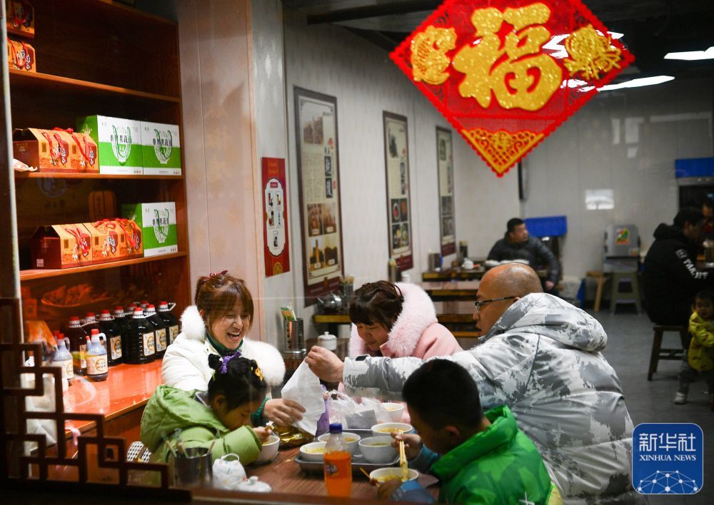 1月24日,在位于陕西省咸阳市的福园巷子街区,游客在一家商铺品尝臊子面。新华社记者 张博文 摄