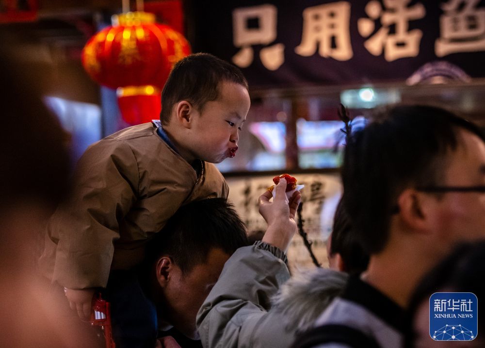 1月24日,在山东省临沂市郯城县郯国古城景区美食街,一名小女孩在品尝美食。新华社发(张春雷 摄)