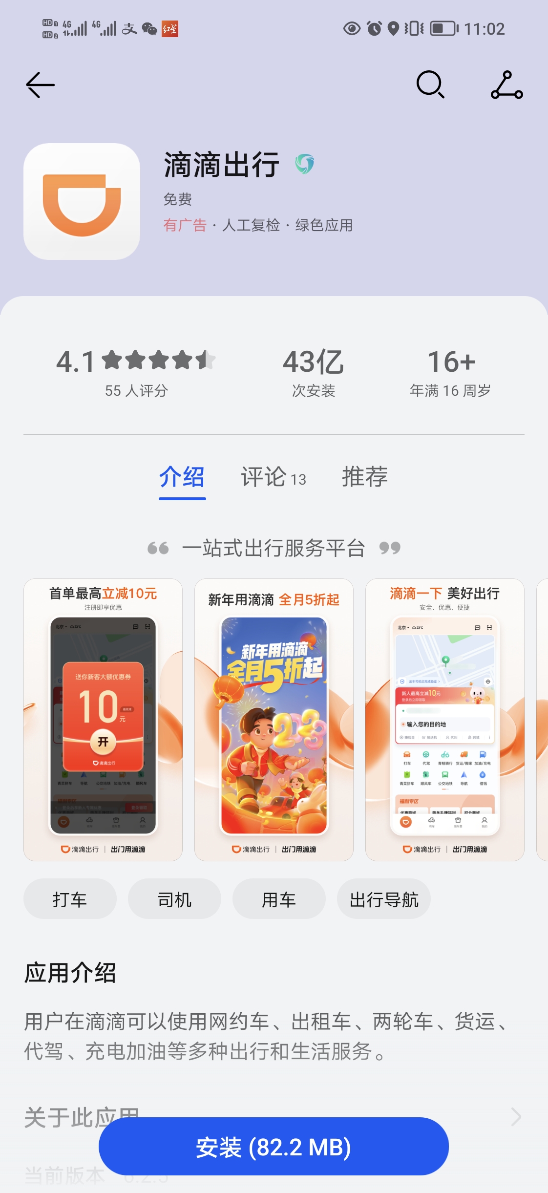 苹果、华为及VIVO应用商店的滴滴出行APP详情图