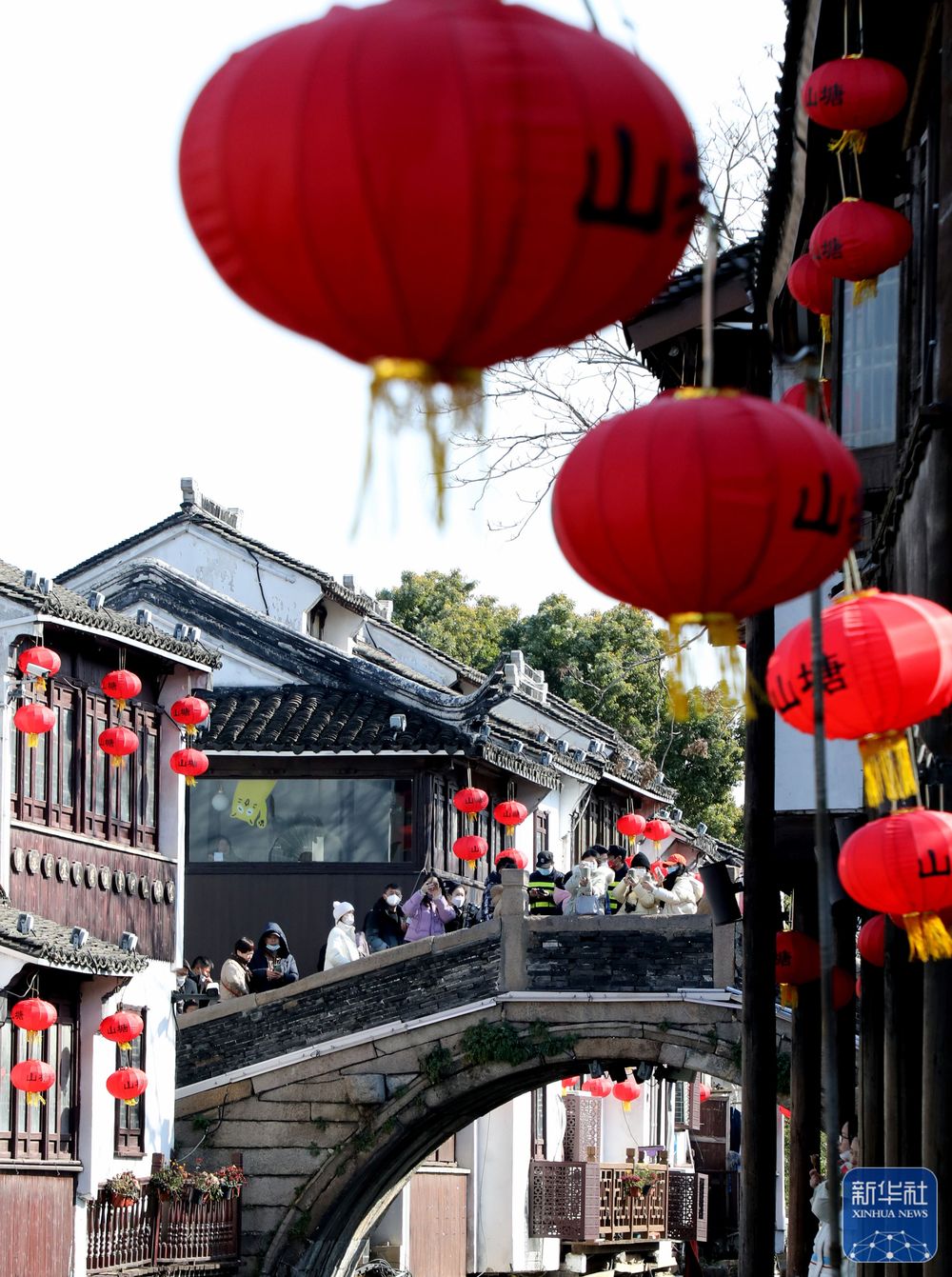 ↑1月27日,游客在江苏省苏州市山塘街观光游览。新华社发(杭兴微 摄)