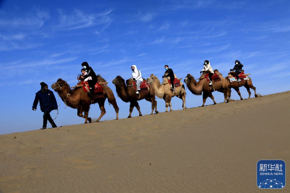 ↑1月27日,游客在甘肃省敦煌市鸣沙山月牙泉景区骑骆驼游览。新华社发(张晓亮 摄)
