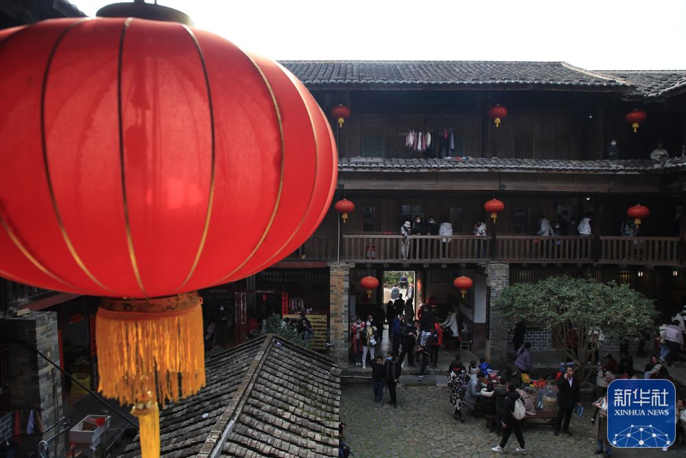 ↑1月25日,游客在福建省龙岩市永定区土楼景区游玩。新华社发(周杨东 摄)