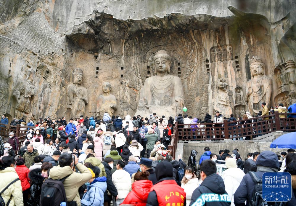↑1月26日,游客在河南省洛阳市龙门石窟景区内游览。新华社发(张怡熙摄)