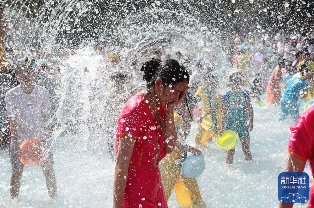 ↑1月25日,游客在西双版纳傣族园景区参加“天天泼水节”活动。新华社发(李云生 摄)