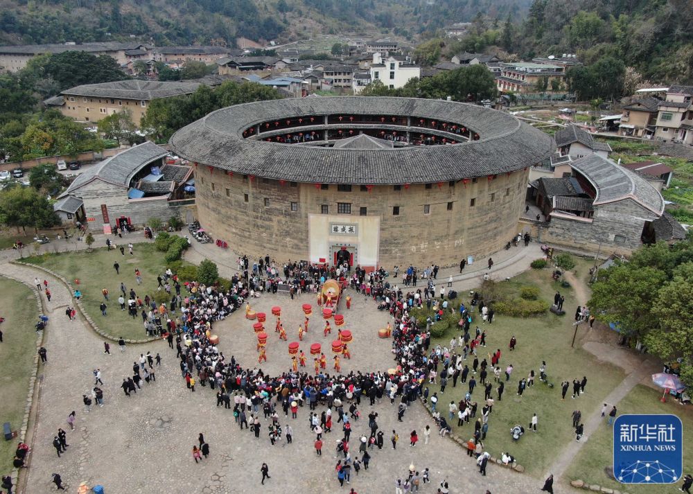 ↑1月25日,游客在福建省龙岩市永定区土楼景区观看民俗表演(无人机照片) 。新华社发(周杨东 摄)