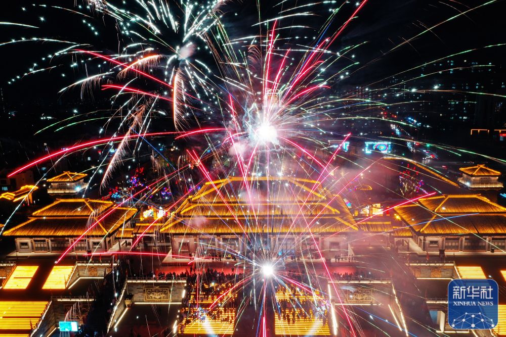 ↑1月27日晚,游客在山东省郯城县郯国古城景区观赏烟花(无人机照片)。新华社发(张春雷 摄)
