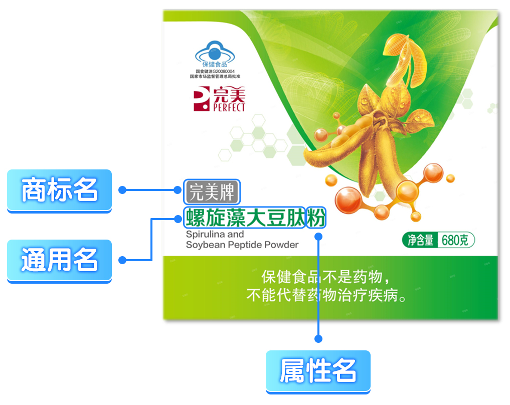 表明产品主要原料等特性的名称。(如:芦荟王浆矿物、螺旋藻大豆肽等)