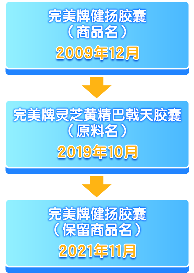 以“完美牌健扬胶囊”为例,随着法规变化,曾经历商品名到原料名的变更;又因健扬胶囊上市多年、商品名深受消费者欢迎,以新法规允许保留商品名为契机,原名称“完美牌健扬胶囊”得以保留。