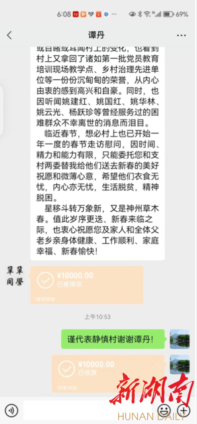 “姚书记,人虽已离开静慎村的工作岗位,但心却时时牵挂着静慎村的一草一木……临近春节,我想委托您和支村两委替我给群众送去新春的美好祝愿和微薄心意,希望他们衣食无忧,内心亦无忧。”1月12日,静慎村党总支书记姚罗华收到了一则感人的微信消息,由茶亭镇农业农村服务中心主任谭丹发来,一片诚挚之语后附着1万元微信转账。