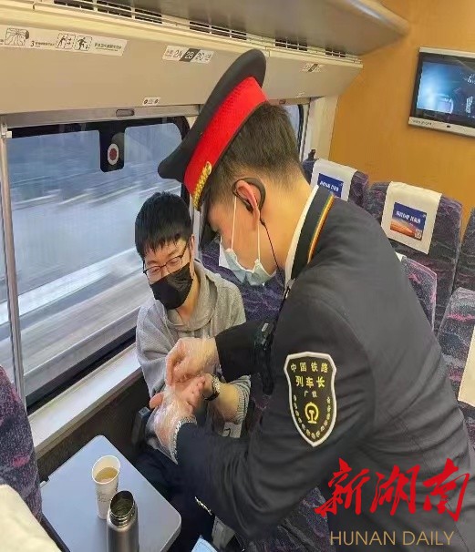 在秦森泽值乘的G6031次列车上,衡阳东站停站时,一位步履蹒跚的老大爷独自走向5号车厢,秦森泽立即搀扶住老大爷,帮助老大爷拿过行李送到座位上,同时嘱咐列车员重点关注这位老大爷。一路上,秦森泽不停穿梭在车厢内,时而整理行李架,时而回答旅客们的问询,忙得不亦乐乎。