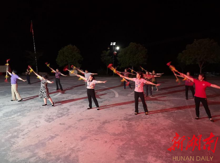 从外地回来的几个年轻妹子,也随兴而动,一起舞动起来。看到远道而来的客人加入,大姐、大妈们更是舞兴高涨,劲头越来越高,舞姿更加精美,连击鼓的大叔也不顾夜晚的寒冷,脱掉外衣,挥舞鼓棒,一时间把整个山村小广场闹腾得热火朝天。领舞的刘玖玲边跳边说:“这几年,栗子坪村富起来了,群众的文化生活也‘富’起来了,跳广场舞已经成为大家每天坚持的文化活动。”