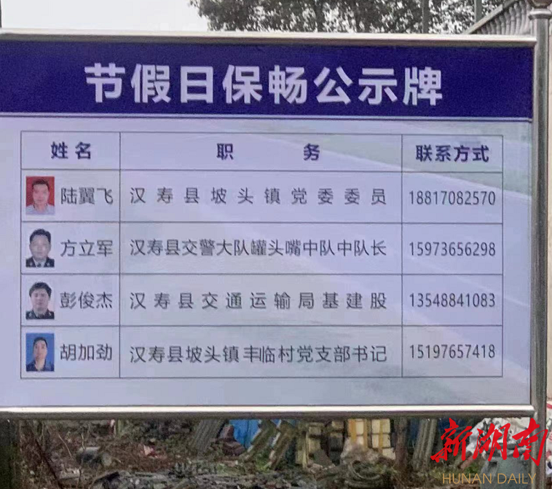 今年春运一开始,汉寿县委、县政府就组织号召全县各级各部门,共同联手,打造平安春运,把工作责任压实压牢在春运基层第一线。全县进一步启动路长制、推进交通保畅举措,所有道路包括乡村小道、县道、转角处等重新张贴路段责任人相关信息415条。