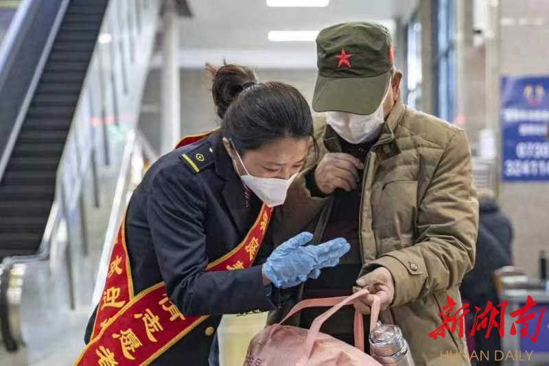 1月7日,2023年春运首日,长沙车务段岳阳车站“洞庭春”服务队,分别在进站口、安检口、候车室等客流集中区域为旅客提供“情暖寒冬”的服务。