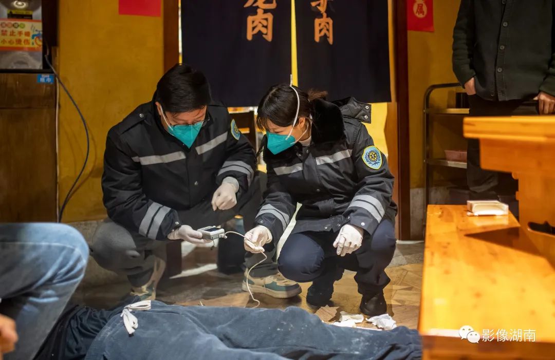 1月19日晚11时45分,长沙市开福区万家丽北路一餐馆,长沙市120急救中心特勤值守队急救医生刘斯亮(右)和护士周帅安为醉酒人员进行紧急救治。