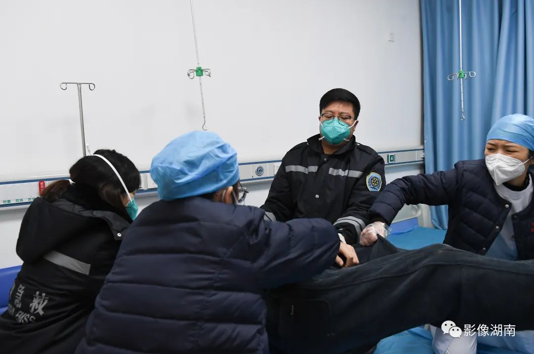 1月20日凌晨,解放军第九二一医院,长沙市120急救中心特勤值守队急救护士周帅安(右二)和医护人员合力将一名患者转移到医院病床上。