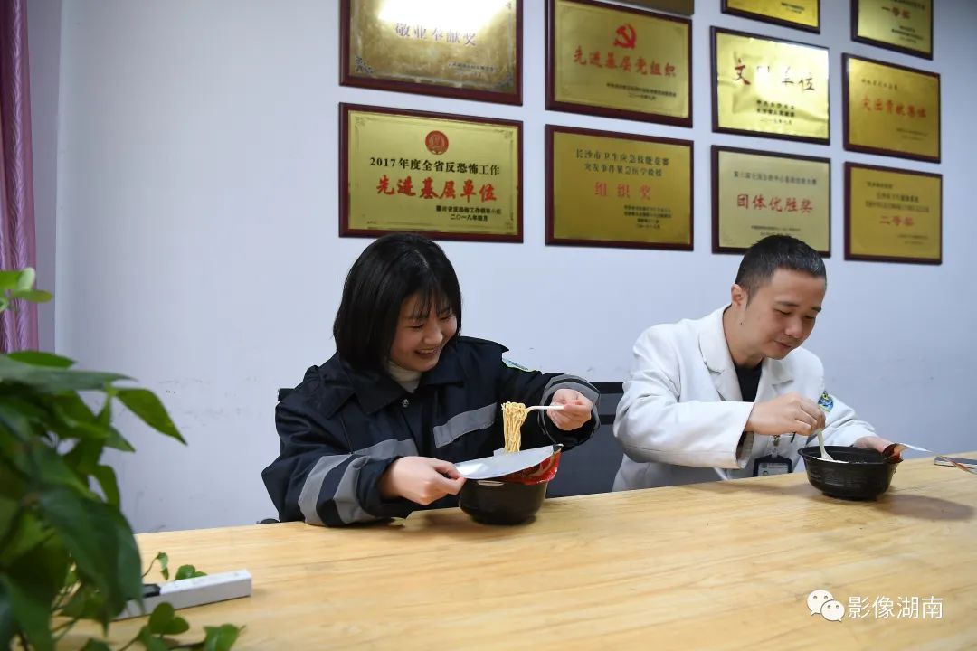 1月21日下午1时31分,长沙市120急救中心直属站,长沙市120急救中心特勤值守队急救医生蒋洁(右)和护士王杏忙完一上午的工作后,才赶回站里吃泡面。这是他们大年三十的午饭。