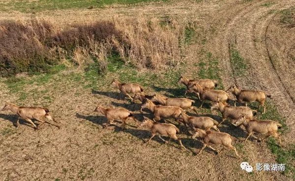 ▲1月9日,东洞庭湖国家级自然保护区,保护区管理局的工作人员在红旗湖区域展开候鸟同步调查时偶遇野生麋鹿群。