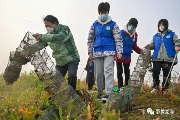 ▲1月11日,西洞庭湖湿地保护协会会长刘克欢(左一)与志愿者一起在湖区对废弃的地笼、渔网等垃圾进行清理。