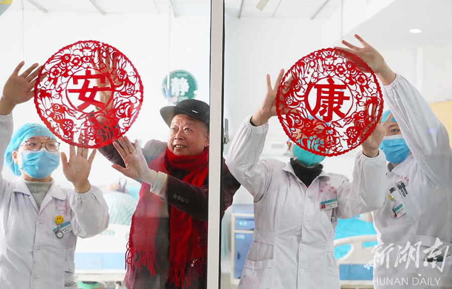 1月20日,新田县人民医院五官科,剪纸非遗传承人刘福忠(左二)和医护人员在张贴窗花。连日来,该县剪纸非遗传承人刘福忠带领家人剪“安”“康”“福”“春”等字和兔子图案送给医护人员和患者,致敬春节期间坚守岗位的“白衣天使”。 刘贵雄 陈祉凝 摄影报道