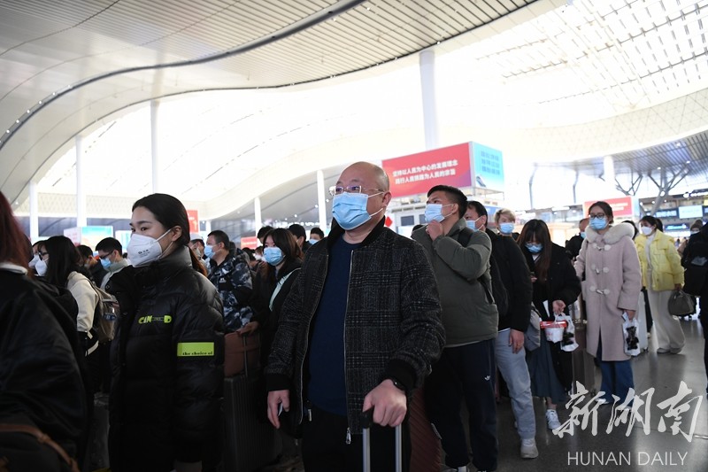 1月29日,高铁长沙南站,乘客在候车室排队准备上车。当天10时4分,满载湖南籍务工人员入穗返岗专列G6017次从高铁长沙南站发车。这是今年广州返岗专列“首秀”,也拉开了广州组织异地务工人员节后有序返穗返岗的序幕。湖南日报全媒体记者 辜鹏博 摄