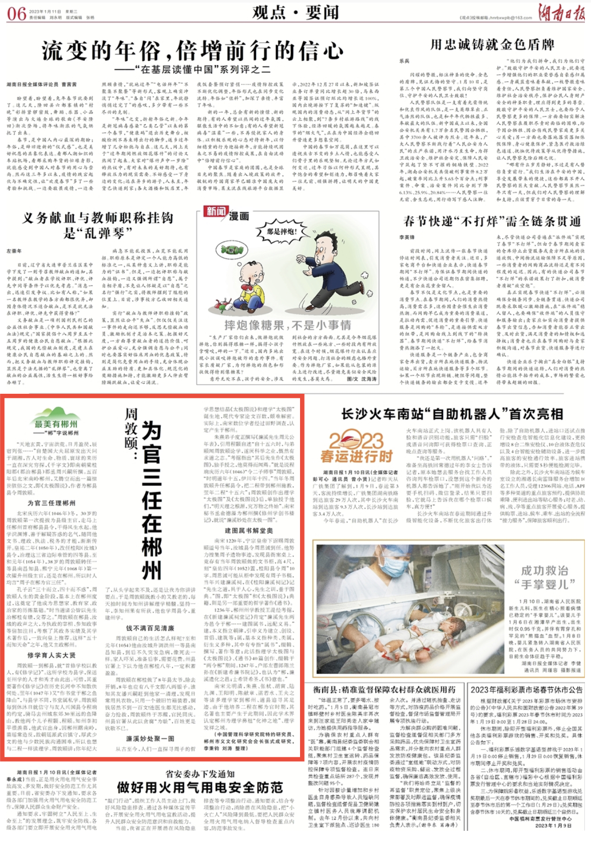 孔子云“三十而立,四十而不惑”,周敦颐人生的黄金阶段,基本上在郴州度过,这奠定了他成为思想家、教育家、政治家的历练基础。“时当道诸公皆以先生治郴桂有绩,交荐之。”周敦颐在郴县、汝城的政声之大,为执政的宰相、参知政事等倍加注目,考察了其政务实绩及其学术著作后,一致向皇上推荐。这样“五十而知天命”之年,他又主政郴州。