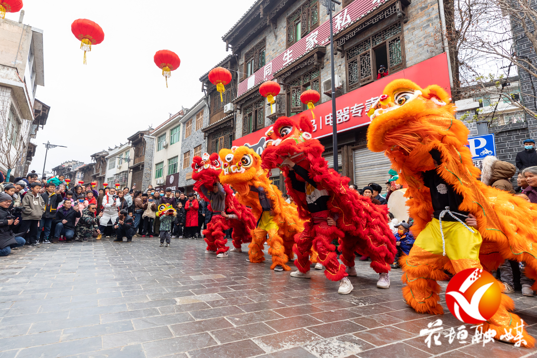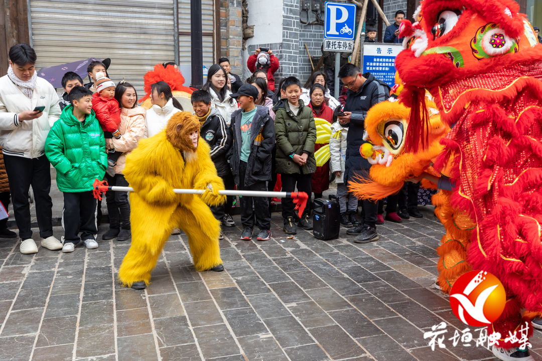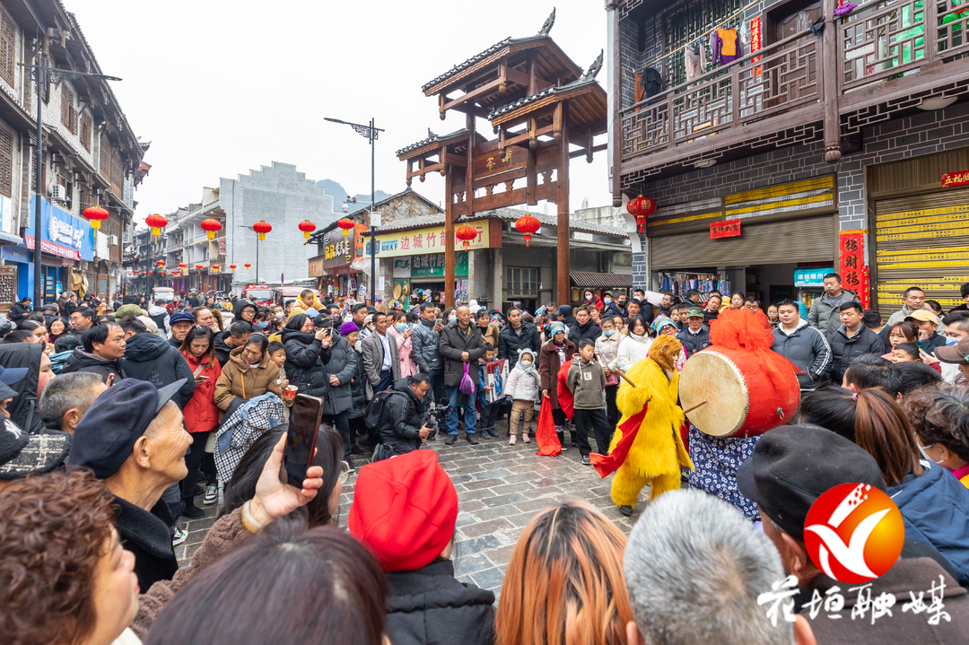 古镇街巷人头攒动,格外热闹;清水江上舟楫往来,游船穿梭;从文路上,“猴王大战醒狮”、舞狮、苗族鼓舞......街头民俗表演给游客带来不一样的体验。