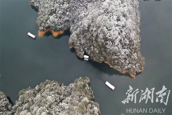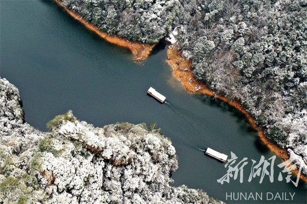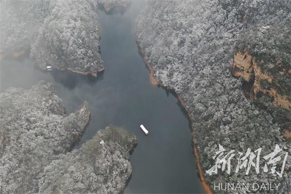湖南日报·新湖南客户端1月16日讯(通讯员 吴勇兵)1月16日,降雪过后的张家界市武陵源区宝峰湖景区银装素裹,白雪妆扮下的峰峦映照在碧水清波间,宛如一幅幅美轮美奂的冬雪山水画卷,游人乘船徜徉其间,美不胜收。